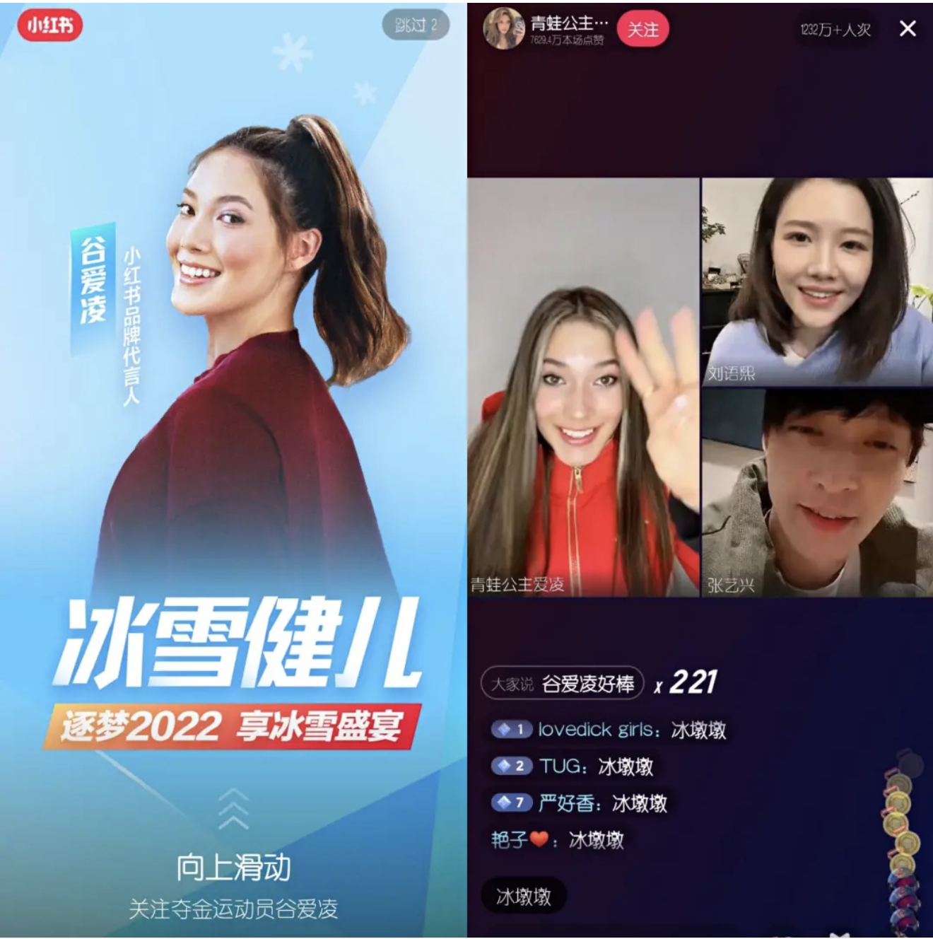 小红书是其中的佼佼者。资料显示,早在2021年12月,谷爱凌就入驻了小红书平台。随后2022年1月,小红书更是官宣谷爱凌为品牌代言人。“经常给在小红书开屏广告看到谷爱凌,有时候是和另一个代言人刘昊然一起,有时候是谷爱凌的单人宣传页面。”妮妮说道。