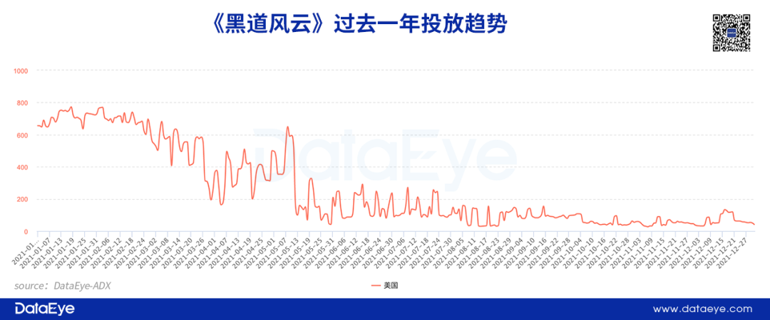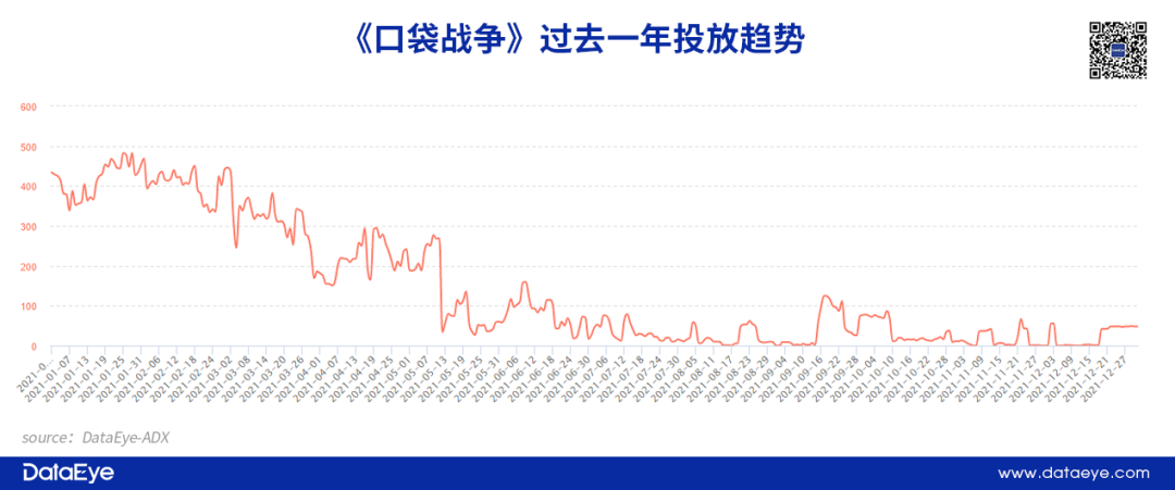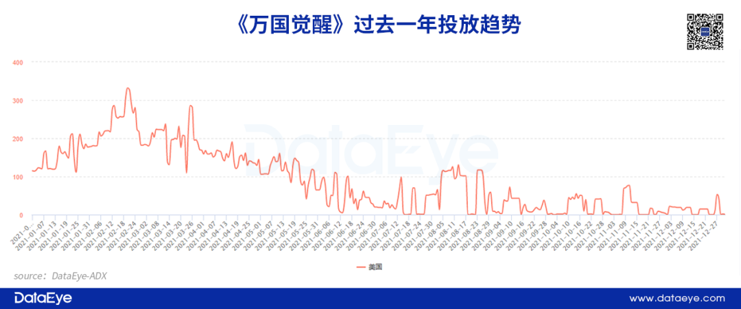 买量现象:上半年大量集火,下半年小量维持。四款游戏仿佛约好一般,都在2021年上半年投入大量素材资源,而在下半年相续出现滑坡式的减量,只是做到维持曝光的水平。以《万国觉醒》为例,上半年日均两百多的投放,来到下半年变得只有少数时间超过百余组的投放。