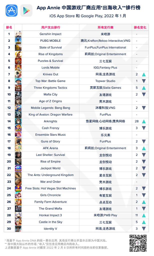 根据App Annie刚刚公布的2022年1月出海收入榜单,TOP30中SLG占据了超过一半的席位。除了出海老大哥《万国觉醒》以外,FunPlus的三款SLG、《末日喧嚣》等游戏都赫然在列。