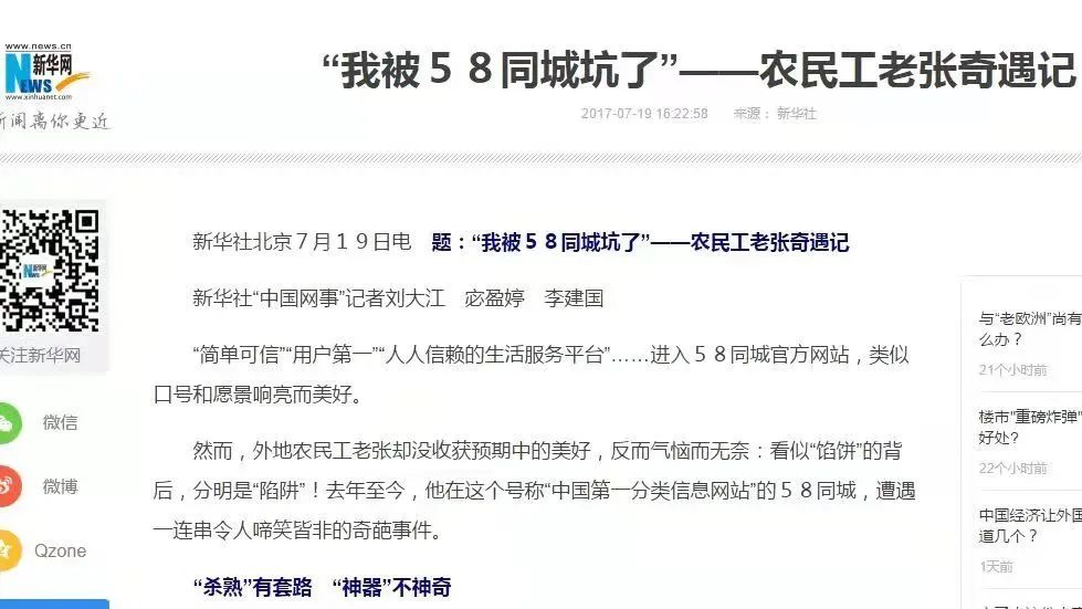 2017年7月,新华社发文揭露58同城“坑人没商量”,借受害者农民工老张之口,直接戳破了58同城“用户第一”的美好口号。