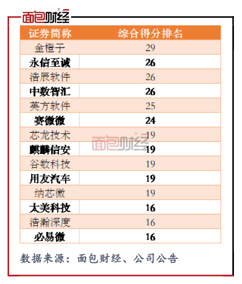 综合评分:金橙子、永信至诚、浩辰软件等得分排名靠后