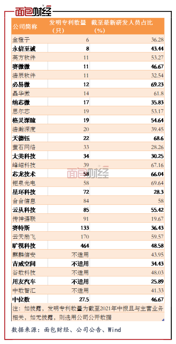 面包财经根据公开数据从研发投入强度、发明专利数量、营收年复合增长率等维度梳理了软件和信息技术服务业行业中,近30家拟在科创板上市公司的研发数据。