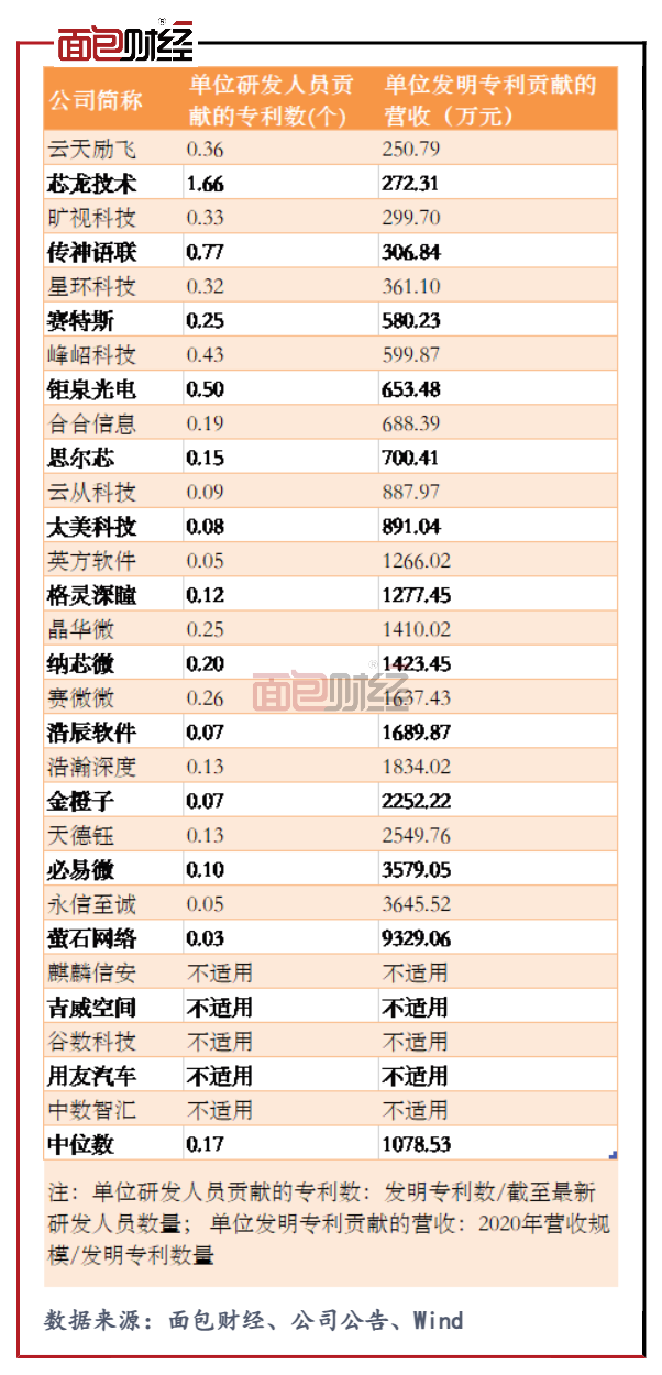 单位发明专利贡献的营业收入指标,一定程度上能说明公司发明专利转化为营收的效率。云天励飞、芯龙技术和旷视科技平均1个发明专利尚不能贡献300万元营收。