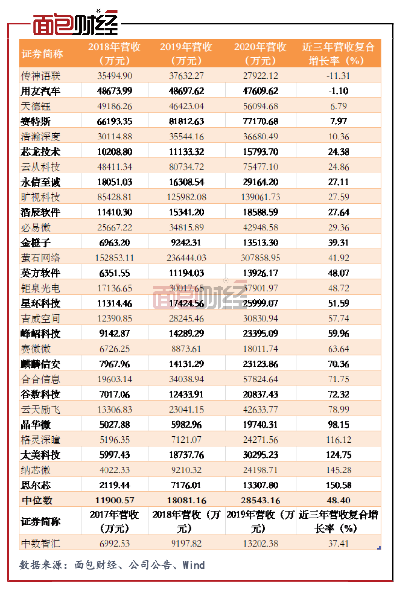 从绝对值方面考量,思尔芯、金橙子、英方软件等公司2020年的营收不达2亿元。截至2020年,萤石网络产生营收30.79亿元,规模在行业新股中居首,该公司近三年的营收年复合增长率超过四成,虽略低于行业中位值。