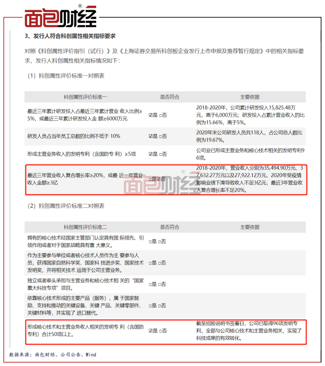 科创属性评价指引还提出营收增速和体量方面的标准:“最近 3 年营业收入复合增长率达到20%,或者最近一年营业收入金额达到 3 亿元。”