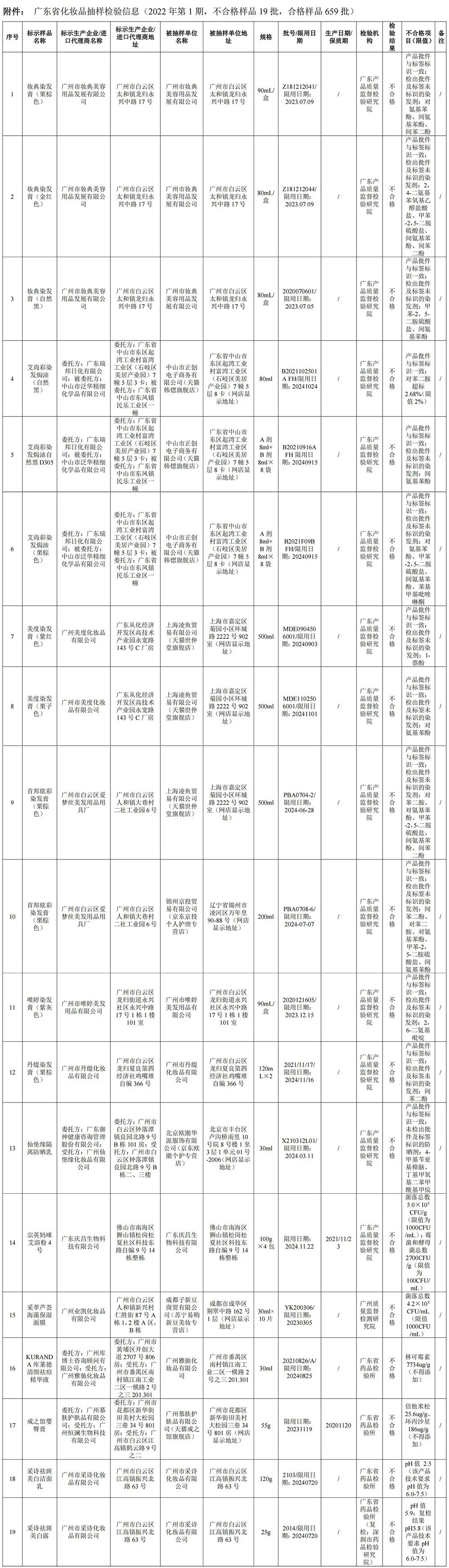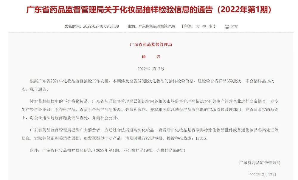 2月18日,广东省药品监督管理局官网发布了关于化妆品抽样检验信息的通告(2022年第1期),根据广东省2021年化妆品监督抽检工作调查,共涉及全省678批次化妆品的抽样检验信息,经检验合格样品共659批次,不合格样品共19批次。