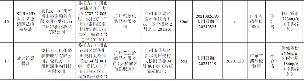检验结果显示,由广州雅驰化妆品有限公司生产的KURANDA库莱德清颜祛痘精华液中使用了禁用原料林可霉素,添加量为7734ug/g。广州慕肤护肤品有限公司的产品戒之馆婴臀膏中,则使用了倍他米松和环丙沙星两种禁用原料,添加量分别为25.6ug/g、186ug/g。