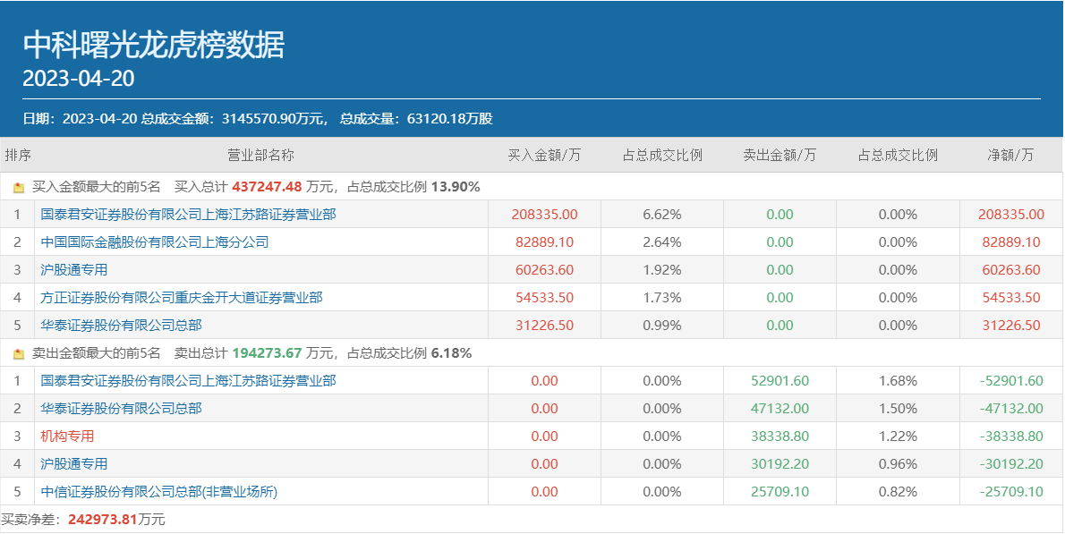 根据中科曙光4月20日披露的3日龙虎榜数据,目前也已经有不少资金在卖出该股,其中有一个机构专用席位居于卖方第三位,卖出金额为3.83亿元,量化基金常用席位华泰证券总部则在买入该股3.12亿元的同时卖出4.71亿元,净卖出金额为1.59亿元。