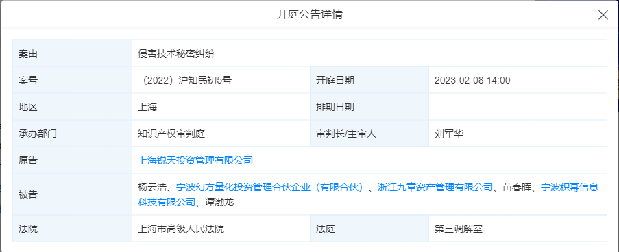 据天眼查APP,一份案号为(2022)沪知民初5号的侵害技术秘密纠纷案件于今年2月8日开庭,原告为上海锐天投资管理有限公司(以下简称“上海锐天投资”),被告为杨云浩、宁波幻方量化投资管理合伙企业(有限合伙)(以下简称“宁波幻方量化”)、浙江九章资产管理有限公司(以下简称“浙江九章资产”)、苗春晖、宁波积幂信息科技有限公司(以下简称“积幂公司”)、谭渤龙等。