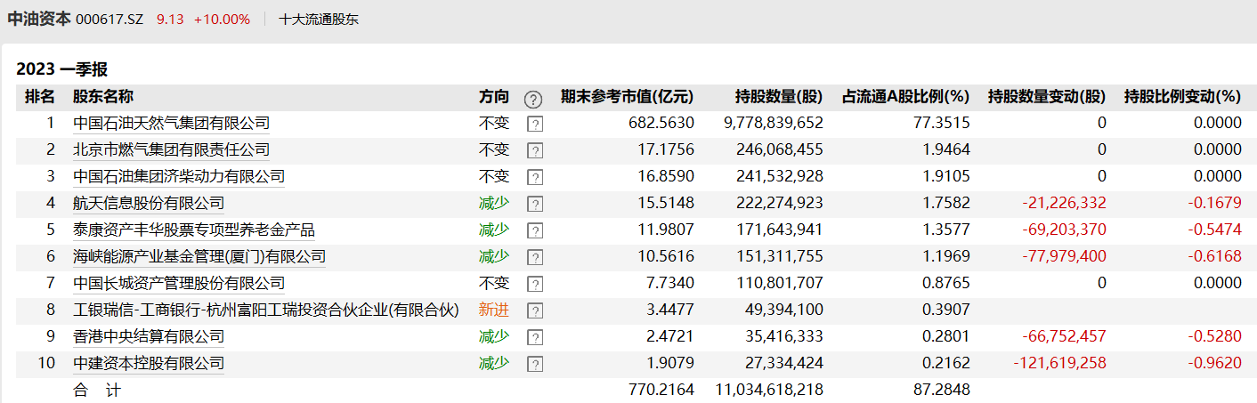Wind数据显示,今年一季度中油资本的前十大流通股东中有一半减持了公司股份,合计的减持数量达3.57亿股,占该股流通A股的比例合计约为2.82%。