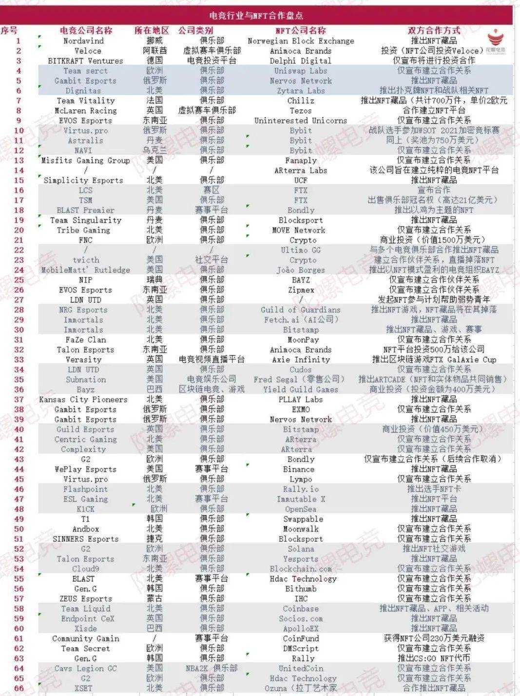 在66起合作中,不仅包含共同推出NFT代币、NFT游戏、建立NFT平台、合作推出以NFT代币为奖励或以NFT游戏为项目的赛事、寻求冠名等形式。甚至也有个人艺术家与电竞组织宣布合作推出NFT代币这样新潮的合作方式。