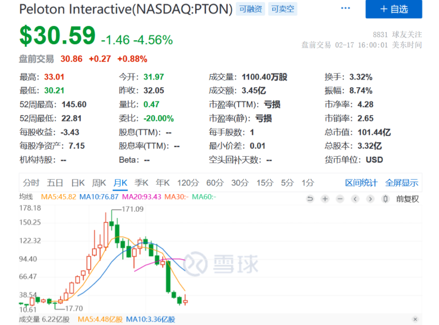 不过,从2021年开始,可以看到Peloton股价迅速回落,到了今年更是跌到谷底,相比最高峰已经缩水80%。