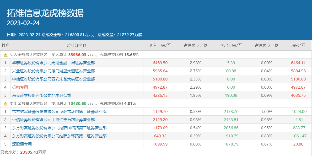 事实上,2月23日机构资金就曾携手买进拓维信息,该股龙虎榜买方前五位中有四个均是机构专用席位,合计净买入1.29亿元,并且2月24日并未有机构专用席位出现拓维信息龙虎榜卖方前五位中。