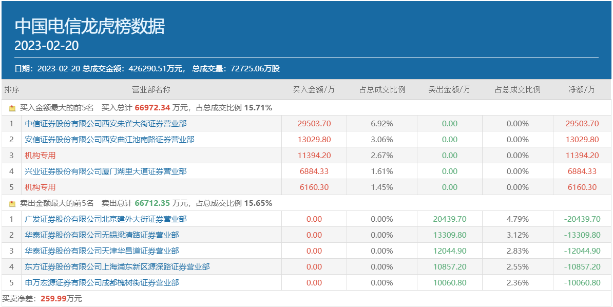 事实上,从龙虎榜数据来看,2月20日也有部分知名游资已经在卖出中国电信,其中,华泰证券无锡梁清路卖出金额为1.33亿元,知名游资小鳄鱼的常用席位东方证券上海浦东新区源深路卖出1.09亿元,另一个知名游资常用席位申万宏源证券成都槐树街卖出1.01亿元。