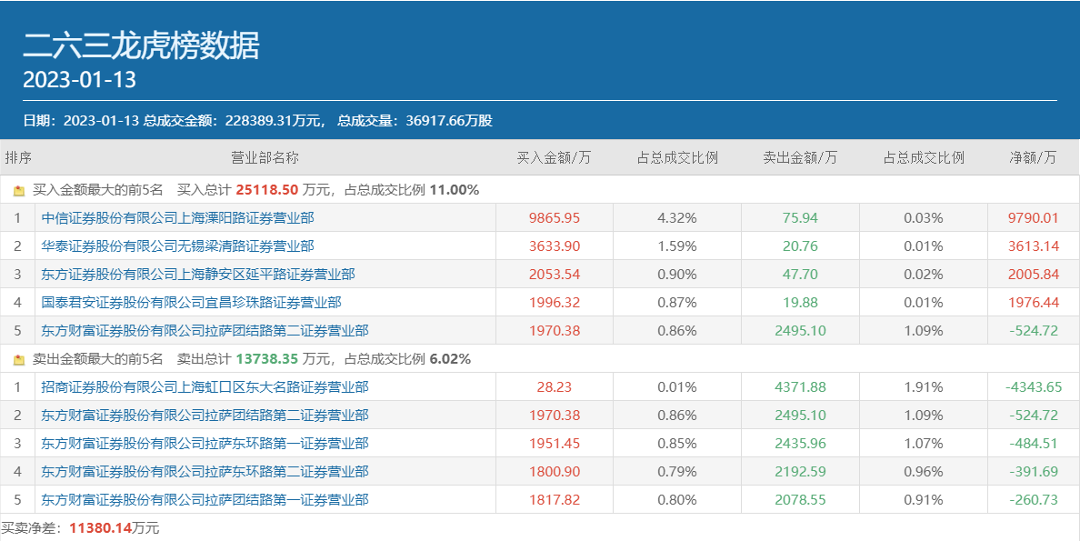 当日披露的龙虎榜数据显示,顶级游资上海溧阳路的常用席位中信证券上海溧阳路高居该股买方榜首,买入金额为9865.95万元。公开资料显示,上海溧阳路为老牌游资席位,多路资金并存,但总体以超短隔夜操作为主,资金实力雄厚,体量较大,截至目前,二六三为上海溧阳路2023年开年以来单次上榜金额最多的个股。