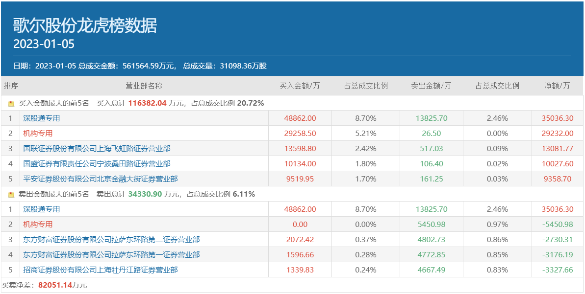 此外,国联证券上海飞虹路以及平安证券北京金融大街1月5日也分别买入歌尔股份1.36亿元和0.95亿元。
