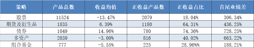 而11524只股票策略私募基金产品2022年的收益均值为-13.47%,正收益产品占比仅为18.04%,整体表现在五大策略私募中排名垫底。