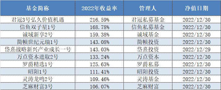 不过,依然有部分股票策略私募2022年的收益表现较为突出,其中排名居于前十位的私募产品该年度均成功实现了翻倍收益。