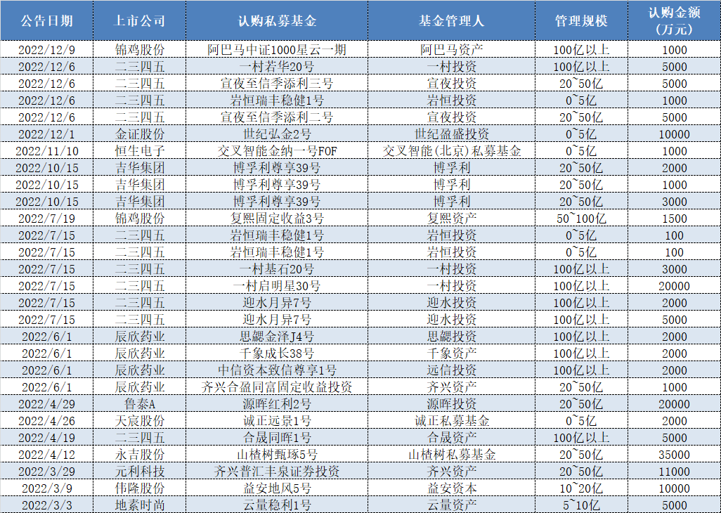 据私募排排网不完全统计数据,2022年已有12家上市公司出手购买私募产品,累计出资金额为16.07亿元。