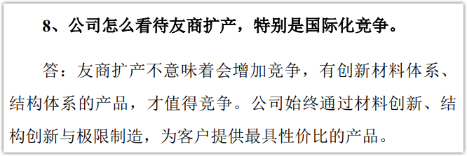 对友商们和自身相似的目标规划,宁德时代还是不太在乎。“友商扩产不意味着会增加竞争,有创新材料体系、结构体系的产品,才值得竞争。”宁德时代如此回答投资者。