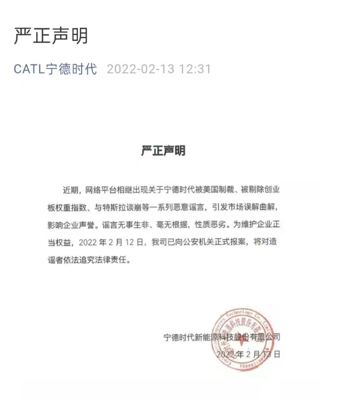 2月8日,网传“宁德时代正在美国向专业机构求助,咨询其被美国制裁的可能性”,随后宁德时代方回应消息不实。