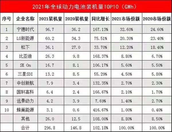 2月7日,韩国市场研究机构SNE Research发布2021年全球动力电池装机量排行榜。在榜单中,宁德时代位列冠军,市占率达到33%;LG紧随其后,市占率为20%。但LG的增长速度明显快过宁德时代。2019年,LG的市占率仅为10%,彼时宁德时代市场份额为28%。