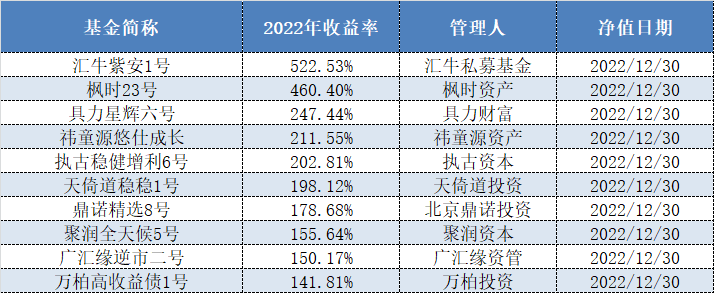 祎童源资产的“祎童源悠仕成长”和执古资本的“执古稳健增利6号”2022年度的收益率也都超过了200%,分别排在第四和第五位,另有天倚道投资旗下的“天倚道稳稳1号”以198.12%的收益率排名第六。