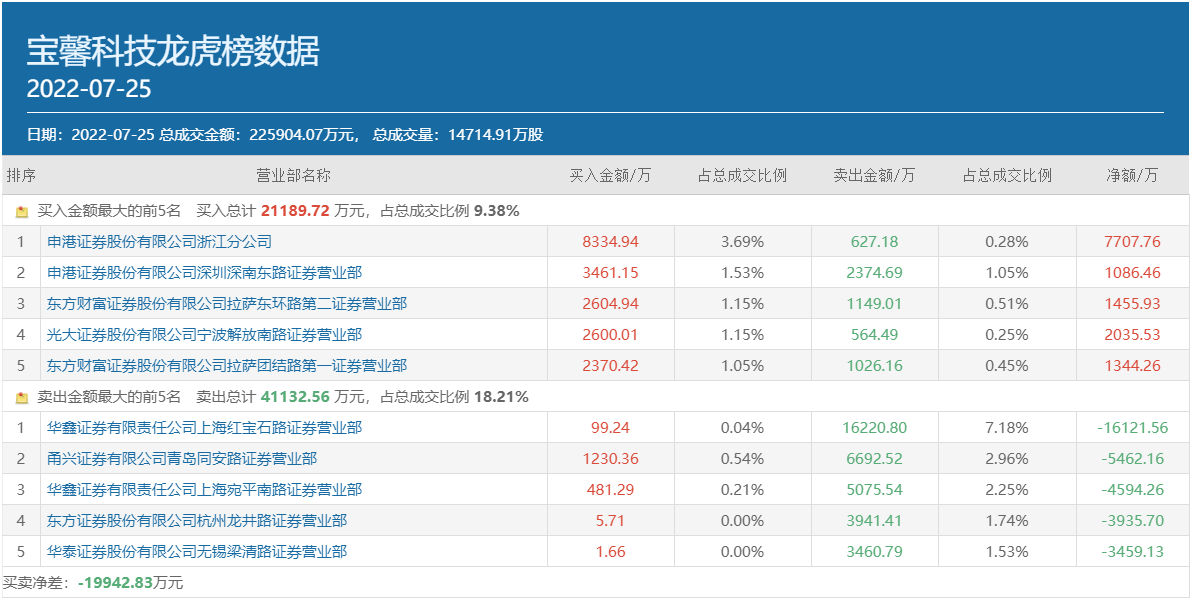 不过,7月25日也有游资依然在积极买进该股,其中知名游资常用席位申港证券浙江分公司以8334.94万元的买入额高居宝馨科技龙虎榜买方榜首,宁波解放南的常用席位光大证券宁波解放南路位列买方第四位,买入金额为2600.01万元。