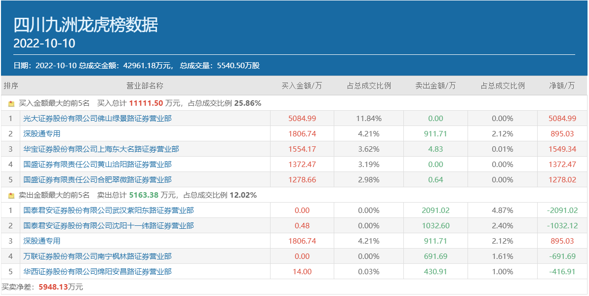 然而,知名游资佛山系却逆风出击,豪掷超过1亿元净买入了两只个股,分别是新华联(000620.SZ)和四川九洲(000801.SZ),其常用席位光大证券佛山绿景路同时高居上述两只个股当日龙虎榜买方榜首,买入金额分别为5059.39万元和5084.99万元。