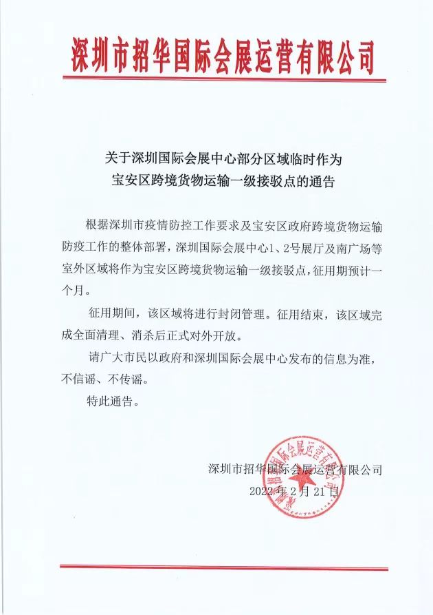 2月21日,据深圳国际会展中心官方公众号,根据深圳市疫情防控工作要求及宝安区政府跨境货物运输防疫工作的整体部署,深圳国际会展中心1、2号展厅及南广场等室外区域将作为宝安区跨境货物运输一级接驳点,征用期预计一个月。