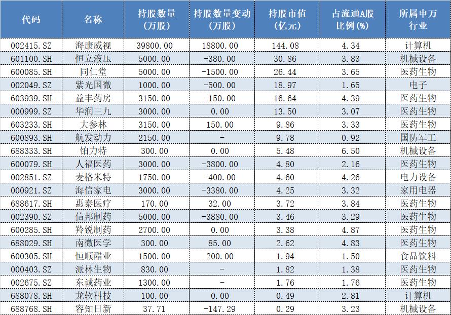 除了海康威视之外,恒立液压(601100.SH)、同仁堂(600085.SH)、紫光国微(002049.SZ)、益丰药房(603939.SH)等中报时被“高毅邻山1号远望1号私募基金”持仓的市值也分别高达30.86亿元、26.44亿元、18.97亿元和16.64亿元,不过与一季度末的持股数量相比,上述个股二季度均遭遇了冯柳的减持。