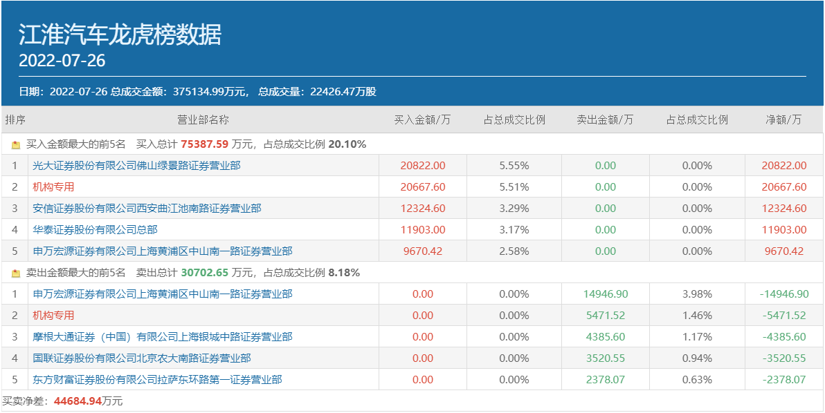 当日披露的龙虎榜数据显示,江淮汽车买方前五位合计的买入金额为7.54亿元,占其成交总额的比例合计高达20.1%。