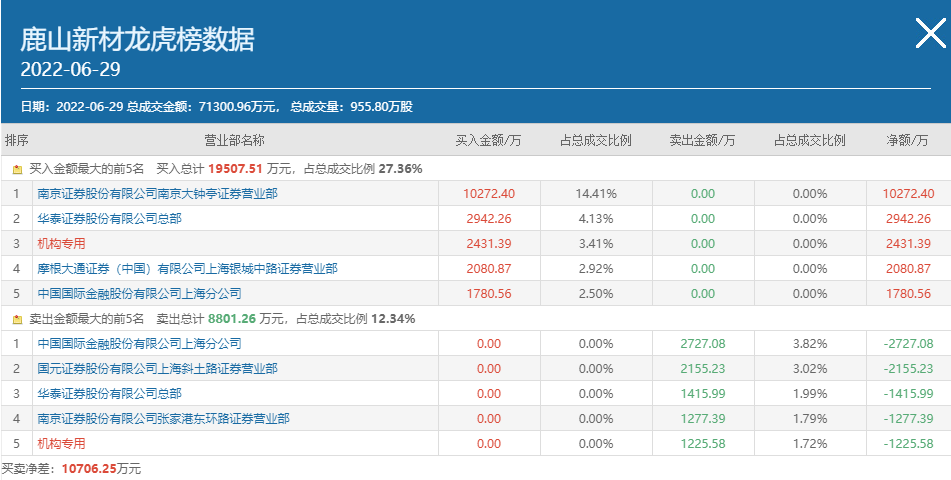 事实上,6月28日南京证券南京大钟亭就曾出现在鹿山新材买方榜首,买入金额为6531.54万元,当日披露的3日龙虎榜中上述席位也高居买方第一位,买入金额为1.09亿元。