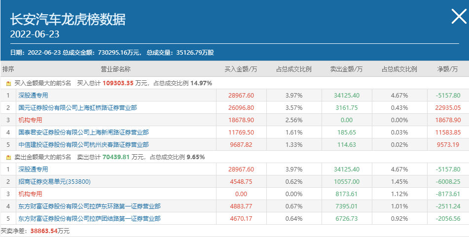 另外,最近北上资金在持续卖出长安汽车,Wind数据显示,深股通持仓长安汽车的股份数量已经从6月16日的1.71亿股,下降至6月22日的1.34亿股。6月23日深股通专用席位同时高居长安汽车龙虎榜买卖双方榜首,净卖出金额为5157.8万元。