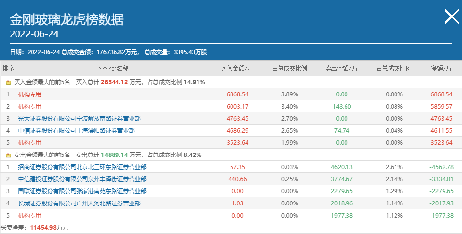 金刚玻璃本次强势涨停的背后,少不了各路资金的竞相追捧,当日披露的龙虎榜数据显示,该股买方前五位合计的买入金额为2.63亿元,占其当日总成交额的比例为14.91%,其中有多达3个席位均为机构专用席位,合计的买入金额高达1.64亿元。