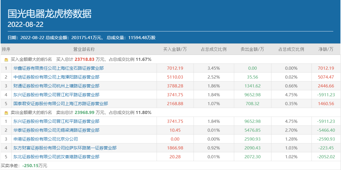 8月22日,位列该股买方前三位的财通证券杭州上塘路、东兴证券晋江和平路以及国泰君安证券上海江苏路也分列卖出了国光电器1341.62万元、9652.98万元和708.32万元,另有知名游资席位申港证券北京分公司亦卖出该股2590.93万元。