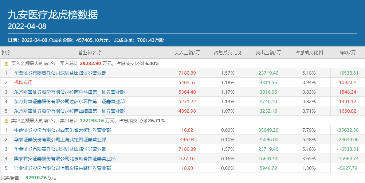 与此同时,九安医疗当日龙虎榜买方前五位合计的买入金额仅为2.93亿元,并且位列买方榜首的华鑫证券深圳益田路实际上净卖出高达1.65亿元,买方榜单上的其余四个席位也均是有买有卖,净买入金额最多的也仅有1660.82万元。