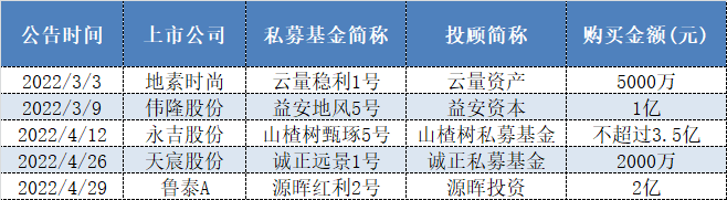 另外,伟隆股份(002871.SZ)、地素时尚(603587.SH)、天宸股份(600620.SH)等也在年内出手购买了私募产品,购买金额分别为1亿元、5000万元和2000万元,涉及的私募产品分别为“益安地风5号”、“云量稳利1号”和“诚正远景1号”等。