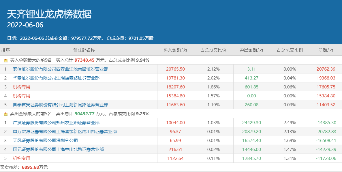 不过,在上海溧阳路等游资携手部分机构资金积极做多的同时,也有一个机构专用席位在6月6日净卖出天齐锂业1.17亿元,知名游资席位广发证券郑州农业路当日整体亦是净卖出,在买入1亿元的同时,卖出天齐锂业2.44亿元。