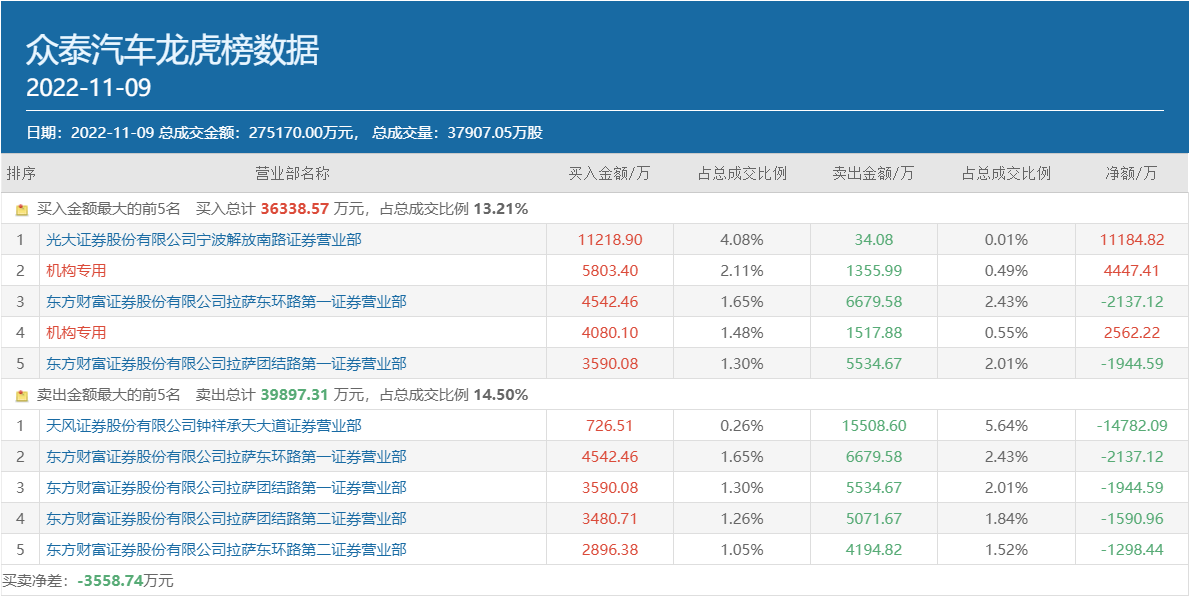 值得一提的是,11月9日机构资金也在积极买入众泰汽车,有两个机构专用席位出现在该股买方前五位中,净买入金额为7009.63万元。