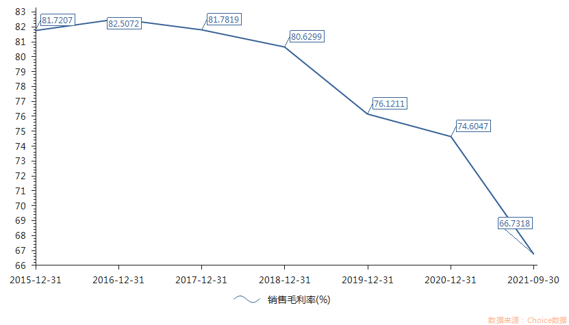 伴随业绩走低,该公司的毛利率也持续下滑,从2020年的74.6%跌至2021年的66.73%,变动幅度超10%。去年前三个季度,之江生物的单季度毛利率分别是72.12%、67.88%、60.06%。