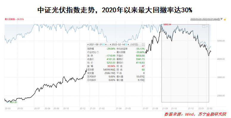 在“双碳”目标的制定下,光伏行业在近两年的时间内,成为资本市场上绝对的宠儿。以2020年3月疫情后的低点到2021年9月的最高点来看,代表光伏行业表现的中证光伏指数在一年半的时间内涨幅达215%。但随着2022年一批光伏产业的上市公司发布业绩预报,超过一半的上市公司业绩预亏,中证光伏指数也同样再次迎来一波较大幅度的回调,2020年以来的最大回撤率已达30%。