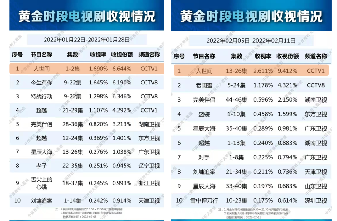 开播以来,《人世间》蝉联黄金时段电视剧收视第一名;CSM全国网平均收视率创CCTV-1近三年电视剧新高;爱奇艺站内热度突破9000,并在猫眼、灯塔等平台数据榜也表现上佳,多次拿下电视剧播放量、市占率日冠。热播的同时,剧集在豆瓣也收获了8.1的高分,在开年剧集中可谓当红之作。