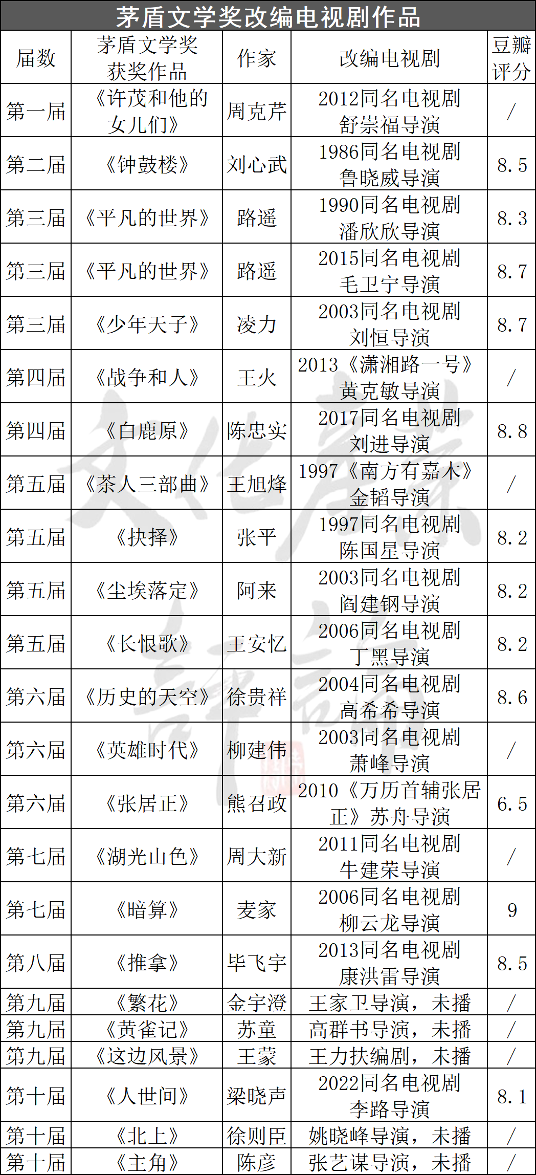 以中国文学界最高荣誉之一的“茅盾文学奖”为例,从1977至今,共举办了十届,有48册作品荣誉加身,其中半数作品有过影视化的经历。尚未播出的几部作品《繁花》《黄雀记》《主角》,也均由王家卫、高群书、张艺谋等知名导演操刀,虽未现世,但已声名在外。