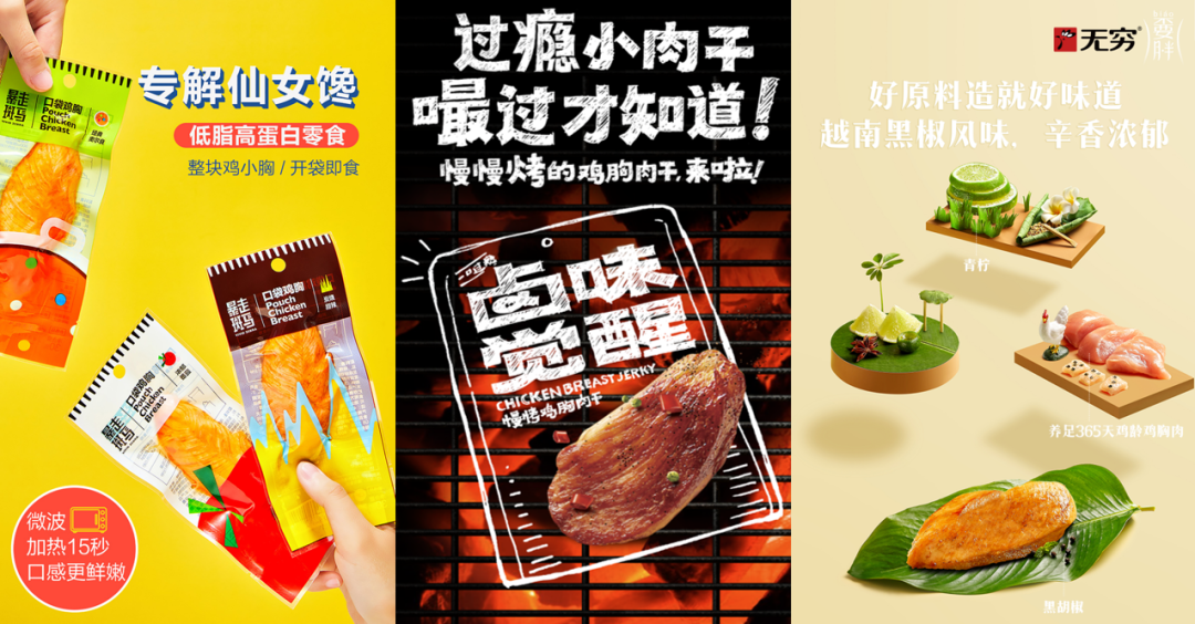 常温鸡胸肉类产品因其高蛋白低脂肪的特点深受轻食爱好者青睐。暴走斑马率先选用正大全产业链鸡小胸,独立包装形式;卤味觉醒将鸡胸肉鲜切成薄片,先卤后烤,最大化保留其低脂高蛋白的优点;无穷食品选用养足365天鸡龄鸡胸肉,先蒸后烘,121°C高温杀菌保鲜技术,锁住新鲜美味···