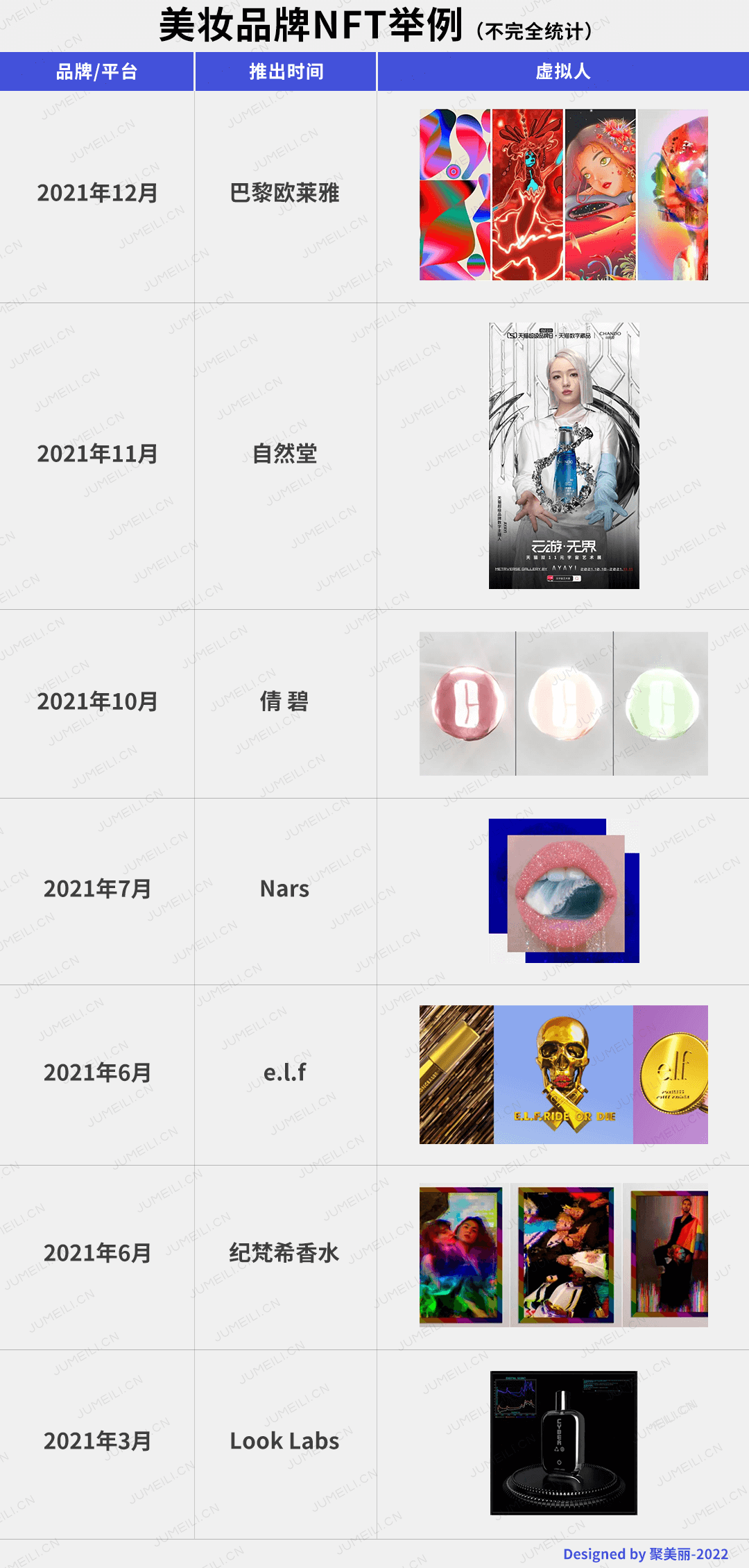 在NFT“掘金热”下,不少美妆品牌也推出了NFT产品。例如巴黎欧莱雅委托五位知名艺术家为品牌新款口红Reds of Worth创作NFT艺术品,该艺术作品可通过 OpenSea平台拍卖获得,每个NFT的最低起价为1500美元,拍卖所得归艺术家所有;自然堂则牵手虚拟人AYAYI,与天猫打造“喜马拉雅冰晷”的NFT数字藏品;Look Labs则将香水和NFT结合起来,消费者竞拍NFT香水成功后可以获得香水的NFT数字证书和一瓶固体香水,其中NFT香水由红外线将香水编码,未来可以依靠科技“再现”香味。