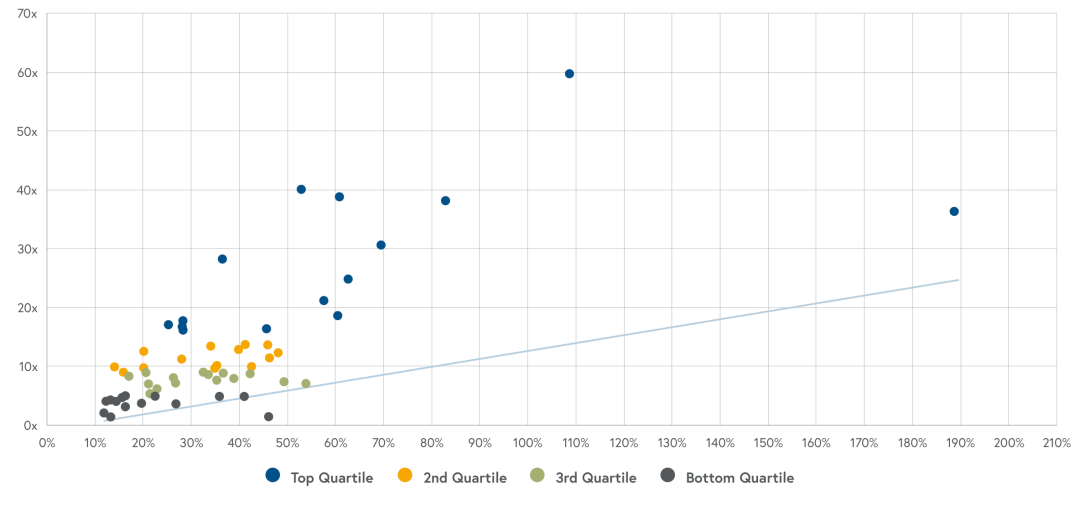 上图中横轴为营收增速,纵轴为营收倍数,在BVP指数中,经过近几个月市场的调整,尽管上述点状分布仍然较为分散,但相较前期已经较为集中了,也就是说,增速与营收倍数越来越向正相关性靠拢。