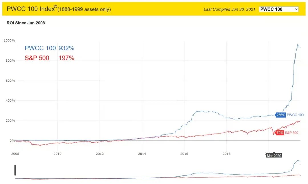 有了炒作+赌博的属性加持,这个市场就活了,各种各样的卡的价格在急速飙涨,而且五花八门的开盒视频在哔哩哔哩,抖音,斗鱼等视频直播平台上进行传播,越来越多的圈外人开始涉入TCG圈子,指望靠着开盒炒卡实现暴富梦,于是炒卡收益率激增,其中部分球星卡的收益一度大幅碾压了标普500[4]。