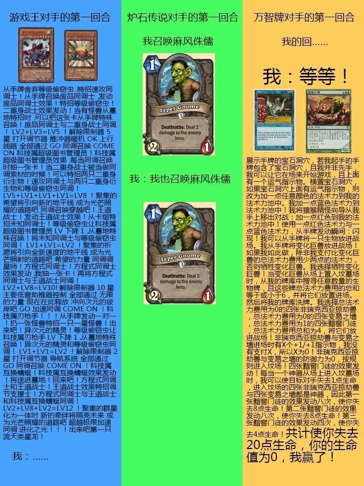 游戏本身的规则一改再改不说,一张卡上面描述文字密密麻麻近10行,打起牌来说清楚你在干什么都要费不少口水,游戏王也因此得了个外号叫“说书王”。隔壁在线卡牌游戏炉石传说可就简单了不止一星半点。