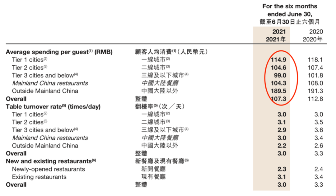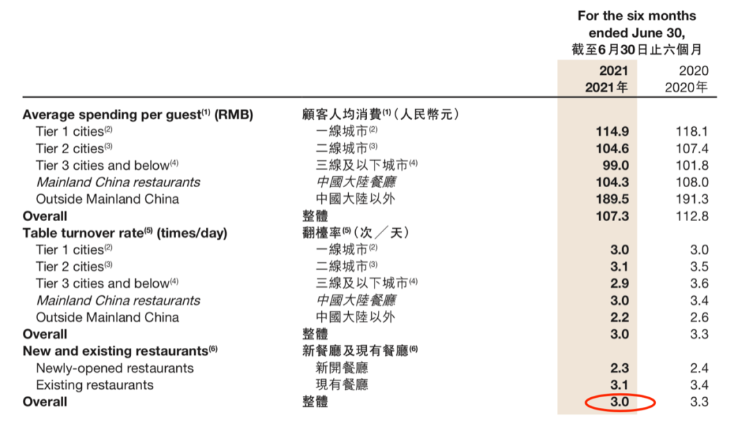 如2017、2018年,海底捞的翻台率连续两年保持了5.0的水准,2019年也依然还有4.8。而到了2020年,这一数字直线下滑到3.3,2021年上半年,则继续下滑至3.0。